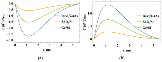 we obtain a closed system of Equations (15), (19), (23) and (24) with an additional condition . Here, εd is the dielectric constant of the film material. Thus, we obtain an expression for the electrostatic potential, the electric field strength F(x) and the conduction electron concentration in the vicinity of the semiconductor film–substrate strained heteroboundary with the mismatch of lattice parameters of the contacting materials: