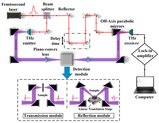 The terahertz time-domain spectroscopy system TeraPulse 4000 (TeraView Ltd., Cambridge, UK) is used in this study. The principle of the system is shown in Figure 1. Femtosecond laser is transmitted to the photoconductive THz emitter, and the terahertz waves are generated and radiated under the action of the biased electric field. Then, the terahertz waves are transmitted to the detection module (including the transmission module, reflection module, etc.), collected by the parabolic mirrors, and sent to the photoconductive THz receiver. It is worth mentioning that the terahertz waves enable to scan the entire sample plane depending on the linear translation stage in the reflection module, which allows the sample to be tested comprehensively. Since terahertz waves are greatly affected by moisture in the air, it is necessary to place the THz emitter, receiver, and all optical paths in a closed environment filled with dry nitrogen gas during the experiment.