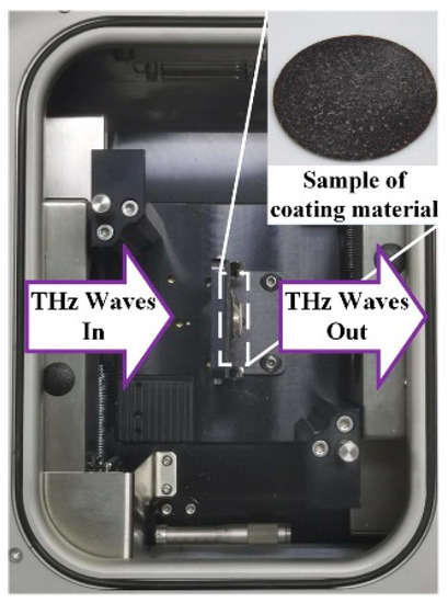 In this study, five pieces of thin coating sample (denoted as S1, S2, …, S5) with different material ratios are used to explore the dielectric response characteristics of the coating materials in the THz band, and provide real physical parameters for subsequently establishing the model of terahertz wave propagation in the coating system. The coating material is an isotropic composite material, which is composed of matrix resin mixed with lubricating and wear-resistant fillers. The transmission module of TeraPulse 4000 (TeraView Ltd., Cambridge, UK) was used to measure coating material samples with five different material ratios, as shown in Figure 2.