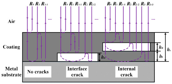 The coating should be detected by reflection in practice, which considered that the terahertz waves cannot penetrate the metal substrate of self-lubricating sliding bearing because of the total reflection for metal materials. Figure 4 shows the schematic diagram of terahertz wave propagation in the coating containing crack defects, where