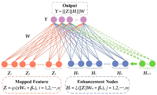 Broad learning system (BLS) is a novel framework developed in recent years and has become popular because of its outstanding performance in machine-learning tasks [36]. As shown in Figure 5, the basic BLS structure contains three essential parts, namely mapping feature nodes Zi, enhancement feature nodes Hj, and output matrix Y. The weighting matrixes Wei and Whj, and the bias terms βei and βej are all generated randomly. The output-layer weight W is obtained by the pseudoinverse algorithm [37]. Different from networks with deep structures, BLS has higher training efficiency due to its more concise structure [38]. The other attraction of BLS is its incremental learning capability, specifically, the system can be updated rapidly without having to rebuild the entire network when facing newly added samples and hidden nodes [39].