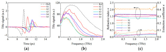The transmission measurement results of five types of coating materials described in Section 2.1 are shown in Figure 6. From Figure 6a,b, it can be seen that the transmitted signals of the five materials shift and attenuate compare with the reference signal. However, the characteristics of the transmitted signals remained obvious, that is, the terahertz waves have good penetration for the five types of coating materials. In addition, the distinct response is shown in the different types of coating materials, which indicates that terahertz waves are very sensitive to the variation of dielectric properties caused by the change in coating materials composition.