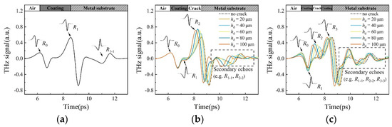 Simulation signal of terahertz wave propagation in coating (hc = 225 μm, hl = 100 μm): (a) No cracks; (b) Interface cracks; (c) Internal cracks.