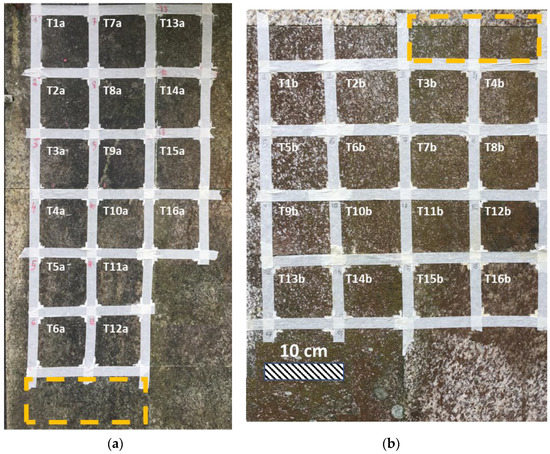 In particular, the wall apparently showed two types of biocolonization. This assumption arises from observed differences in color occurring between two different zones of the granite surface (Surface a and Surface b), as reported in Figure 1.