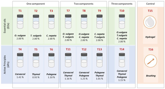 The treatments were left to act for one month, and then removed. Pure hydrogel (T15) and mechanical brushing with a hard brush on a humid surface (T16) were also used. All the treatments, the compositions and the overall concentrations are schematically shown in Figure 3. However, the method used and the concentrations of each EO and APs present in the formulations, as results of the experiment, are described in detail in Section 3.2.