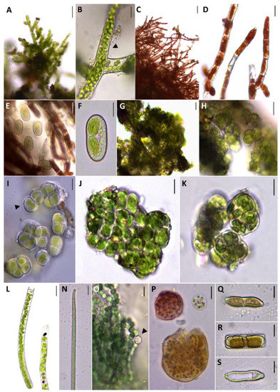 Taxa identified in sampled subaerial biofilms: (A,B) protonema of bryophyta; (C,D) Trentepohlia aurea (Linnaeus) C. Martius; (E,F) Mesotaenium macrococcum (Kützing ex Kützing) J. Roy & Bisset; (G–I) Apatococcus lobatus (Chodat) J.B.Petersen: diagnostic detail of the cells with bilobate chloroplast without pyrenoid indicate by arrow (I);(J,K) Desmococcus olivaceus (Persoon ex Acharius) J. R. Laundon; (L) Klebsormidium flaccidum (Kützing) P. C. Silva, K. R. Mattox & W. H. Blackwell; (N) Oscillatoria formosa Bory ex Gomont; (O) Nostoc sp. Vaucher ex Bornet & Flahault trichomes without mucilage formed by subspherical cells of 2.0-4.5 µm in diameter and heterocytes indicated by an arrow; (P) Gloeocapsa punctata Nägeli; (Q–S) Hantzschia amphioxys (Ehrenberg) Grunow. Scale bar = 50 µm (A,C,G); 20 µm (E,H); 10 µm (B,D); 5 µm (F,I,K,L–S).