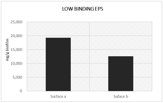 A different microbial composition also produced differences in the content of extacellular polymeric substances (EPS) that are much more abundant in the samples collected from Surface a than in Surface b, as reported in Figure 5.