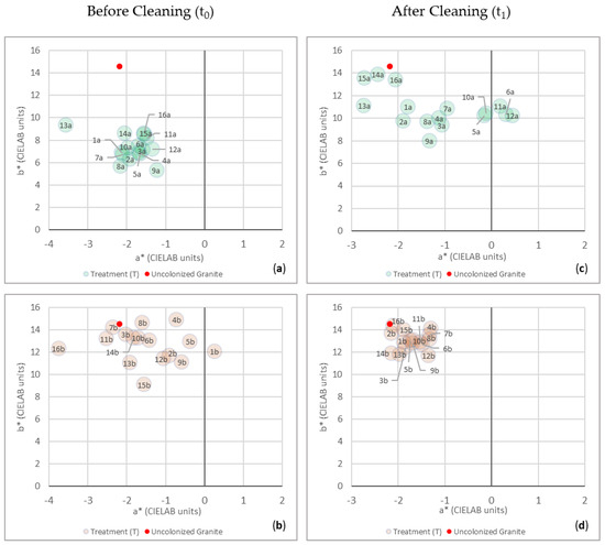 Color changes of the samples from Surface a and Surface b, before (t0) and after (t1) the treatment’s removal, are reported in the colorimetric plane of a* (x-axis, changes in redness-greenness) and b* (y-axis, changes in yellowness-blueness). (a) Color data from Surface a at t0; (b) color data from Surface b at t0; (c) color data form Surface a at t1; (d) color data from Surface b at t1. In each graph, the color of the reference value for the uncolonized granite was also represented (red spot). Each number represents the corresponding treatment (codes are shown in Figure 3), and the letters (a and b) correspond to the surface where the treatments have been applied.