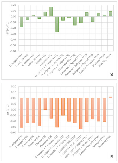 The remaining seven treatments do not show similar results. This is the case of T3a, T5a, T6a, T12a, T14a, T15a and T16a. Between them, T3a (C. nepeta), T5a (thymol), T6a (pulegone), T12a (carvacrol + pulegone) and T14a (carvacrol + thymol + pulegone) are the ones obtained by the combination of the hydrogel and the natural-based biocides. In particular, except for T3a, all of them contain the APs from the essential oils. The highest increase of ∆Y is observed for the treatment containing pulegone (T6a).