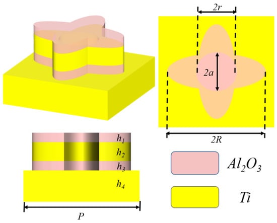 The finite difference time domain method is used in the simulation with 3D FDTD solutions software [29,30]. By applying periodic boundary conditions in the x and y directions, the entire arrays can be simplified to a unit cell. The transverse magnetic mode (TM, x-axis polarization) plane waves are incident vertically from above the arrays, and the transmission and reflection effects are truncated by perfect matched layer boundary in the z direction, and all three directions of mesh are set to 2.5 nm. TM mode and transverse electric (TE) mode here is the x-axis polarization or y-axis polarization of the incident light, respectively. The detailed parameters of the proposed absorber in the simulation are taken as P = 400 nm, R = 170 nm, r = 65 nm, a = 70 nm, h1 = 60 nm, h2 = 115 nm, h3 = 70 nm and h4 = 200 nm, and parameters for metal Ti and Al2O3 are taken from the experimental data of Palik [31]. In the simulation, the transmission T and reflection R of the structure can be recorded by setting the monitor. Then the total absorption A can be calculated using the formula A = 1 − T − R [32,33,34].