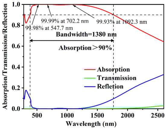 The simulation results of the proposed absorber are shown in Figure 2. It can be seen that the proposed absorber exhibits excellent high absorptivity at the wavelength from 280 nm to 2000 nm, the bandwidth at which absorptivity reaches above 90% is 1380 nm (385–1765 nm), which matches the solar radiation range well. The average absorptivity in the wavelength band of 385 nm to 1765 nm reaches 98.78%. In the entire solar radiation region (295–2500 nm), there is still a high absorptivity of 93.7%. Among them, more than 99% high absorption is achieved at 547.7 nm, 702.2 nm and 1092.3 nm. A comparison with some recent solar absorbers is shown in Table 1 [8,35,36,37,38,39,40], the proposed absorber clearly obtained the widest absorption bandwidth.