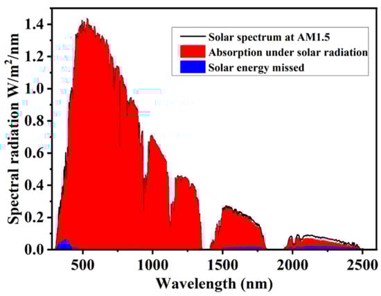 For reference, the AM1.5 solar radiation spectrum is plotted with a black curve in Figure 3. The large red area under the black curve is the solar energy that can be absorbed by the proposed absorber. It is clear that the result is very satisfactory. Most of the energy can be absorbed, and the lost energy is represented by the blue area in Figure 3. It is very intuitive to see that its proportion is very low, and it is mainly concentrated in the two bands of 290–500 nm and 1500–2500 nm. A smaller blue area means a lower amount of energy was missed. The missed solar energy was only 1.6% at the wavelength from 280 nm to 2600 nm. This also means the global absorption effect of the proposed material is excellent and matches the solar radiation well.