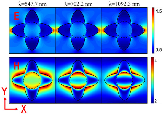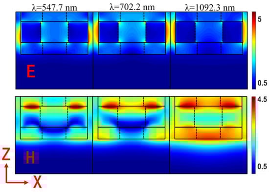 Through the electromagnetic field distribution diagram, we can intuitively understand the physical mechanism of the ultra-wideband perfect absorption of the absorber, and optimize the structure according to its distribution. This method has often been used in previous studies [40,41,42,43,44,45]. We calculated the electric and magnetic field distribution to explore the physical mechanism of our solar absorber at three resonance wavelengths, 547.7 nm, 702.2 nm and 1092.3 nm, as presented in Figure 4 and Figure 5. There are three resonances that excite the ultra-wideband absorption, which are propagation surface plasmon resonance (SPR), localized SPR and Fabry–Perot (F-P) resonance [44,45,46]. This simulation adopted the TM-polarized mode as the incident light. Figure 4 plots the electric and magnetic field distributions of the top views from the XOY direction, and Figure 5 presents the side views from the XOZ direction.