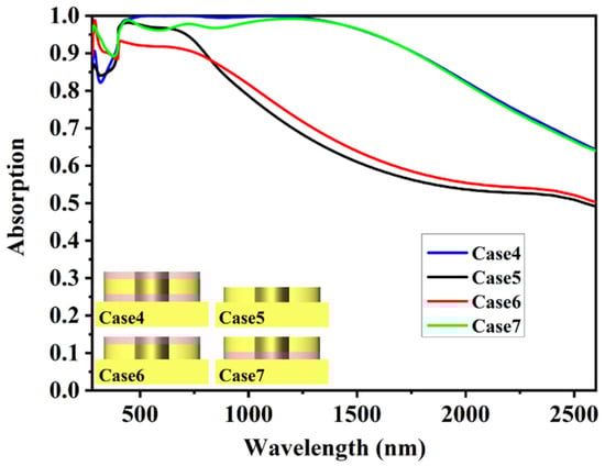 After that, we further investigated the influences of different stacking combinations on light absorption performance, as shown in Figure 8. The absorption when there is no Al2O3 layer but only a layer of Ti substrate and Ti cross elliptical disk is indicated by the black line. For Case6, the red line plots the absorptivity spectrum when there is only one Al2O3 layer covered by a Ti disk on top, and the green line shows only one layer of Al2O3 between the substrate and the Ti disk. As a contrast, the blue line is the proposed array. Clearly, when there is no Al2O3 layer between the substrate and the Ti disk, the arrays only achieve a narrow absorption higher than 90% from 395 nm to 800 nm, and then it drops rapidly after 800 nm. In the whole region, the absorptivity of these arrays only reaches 68.7%. The red line shows that the covered Al2O3 on this kind of array is less effective in improving the absorption. The absorption in the whole region increased by 1.2% to 69.9%. There is an absorption peak of 98.8% that appeared at 292 nm, but the total absorptivity is still low. For Case7, we inserted a layer of Al2O3 between the substrate and Ti disk and realized an absorptivity of 89.3%, as shown by the green line. The result is close to the proposed absorber but slightly lower at the wavelength from 443 to 1190 nm. This demonstrates that the Al2O3 between the Ti disk and the substrate plays an important part in exciting SPR to achieve ultra-wideband absorption. Thus, a layer of Al2O3 covered on this basis further improves the absorption performance, as we proposed.