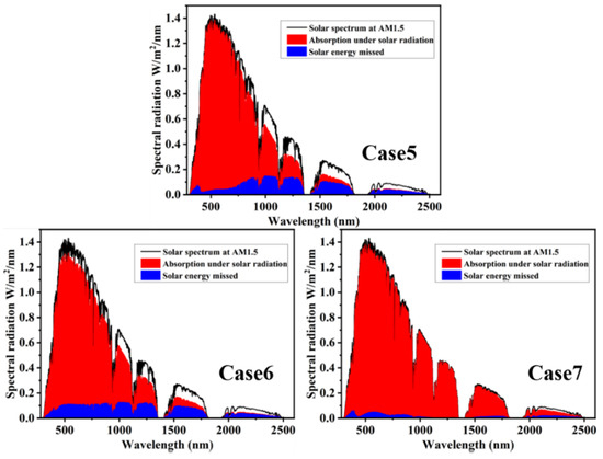 As in the study above, the absorptivity levels of solar radiation shown by Case5–Case7 were also investigated. From Figure 9, it is obvious that there is a high amount of energy missed over the whole region of solar radiation for Case5 and Case6. It is much higher than the 1.6% of the proposed material as the energy missed reached 12.8% and 14.1%, respectively, for Case5 and Case6. We can see that the addition of the inserted layer of Al2O3 greatly increases the absorptivity of solar radiation, and the high amount of energy missed is also reduced to 3.6%. However, there is still a bandwidth with a little lower absorptivity between 490 nm and 950 nm; the Al2O3 covering the top eliminates this loss and reduces the energy loss to 1.6%. The results of different stacking methods show that the metal and insulator in the traditional MIM structure have a huge influence on the excitation of resonances that achieve wideband absorption. While the addition of the top layer of Al2O3 further enhances the overall absorption effect, any part of the proposed absorber is indispensable for the total absorption performance.