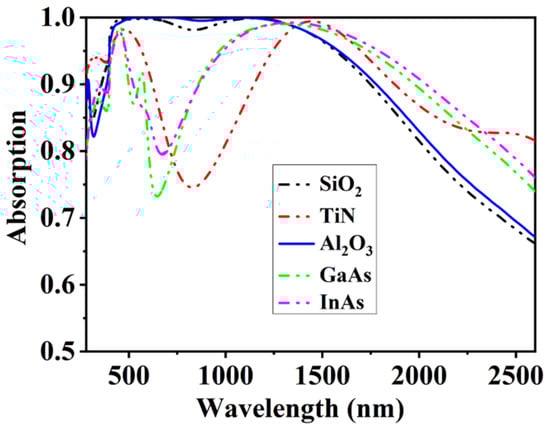 We made a brief analysis of the selection of materials. The imaginary part of the dielectric constant of the metal Ti is higher in the wide wavelength band. The MIM absorber made of metal Ti can obtain high broadband absorption [48]. In addition, the metal Ti has high reserves and good heat resistance. These are the reasons why we adopted the metal Ti. For the selection of dielectric, we performed a simulation comparison as shown in Figure 10. The performance of Al2O3 and SiO2 is in line with our requirements for solar absorbers, and the use of Al2O3 has better average absorption. It is the reason that we selected Al2O3 as the dielectric layer.