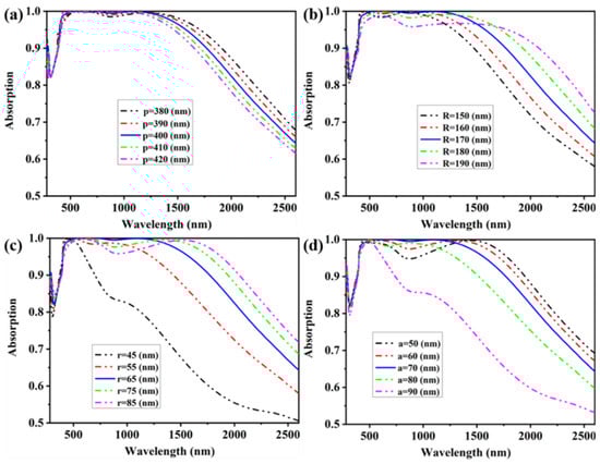 First, we discussed the period P of the overall arrays. The results of the increasing period P from 380 nm to 420 nm in 10 nm steps are presented in Figure 11a. As the period P increases from 380 nm to 420 nm, the bandwidth of absorption above 90% decreases from 1518 nm to 1275 nm. The narrowing of the bandwidth increases the average absorptivity by 2% from 385 nm to 1150 nm where the solar radiation is more distributed. Therefore, finally, 400 nm was chosen as the period P, which can obtain ideal absorptivity. Subsequently, we discussed the influence of the radiuses R, r and a of the cross elliptical disks on the overall absorptivity, and the result is presented in Figure 11b–d. We can see that the absorption of the proposed absorber is insensitive with changes in the structural parameters at a short wavelength. The overall absorption bandwidth broadens out from 1086 nm to 1690 nm as R increases from 150 nm to 190 nm in steps of 10 nm. At the same time, although the wavelength at which the absorption intensity peak appears is red-shifted from 900 nm to 1350 nm, the peak decreases by 3.4% from 99.9% to 96.5%. Changes in r and R have similar influences. When r = 45 nm, there is only one absorption peak of 99.6% at 425 nm, and the absorption peak is red-shifted from 883 nm to 1528 nm, but the peak increased from 98.7% to 99.9% and then decreased to 99.4%. These results are caused by the increase in inductance and capacitance with the increase in geometric size. When r is longer than 65 nm, both perform well in the short wavelength and long wavelength band, but absorptivity is reduced by 4% at most between 700 nm and 1100 nm. For the widest possible absorption bandwidth and an excellent absorption effect, R = 170 nm and r = 65 nm were adopted. Earlier we explained the effect of the air hole in the middle Ti metal layer as shown in Figure 6 and Figure 7. Then, we investigated the influence of the cavity size (radius a) on total absorptivity. Although it has the same trend as Figure 11b,c, it is the opposite to that of the radius a decrease in Figure 11d, as the absorption bandwidth becomes wider. When a changes from 50 nm to 90 nm (R = 170 nm, r = 65 nm), the absorption bandwidth above 90% becomes narrow from 1561 nm to 354 nm. Before a increases to 70 nm, although the bandwidth is wider, there is a significant trough where the absorptivity decreases from 99.5% to 94.7% at 855 nm. After a = 70 nm, without a significant increase in the overall absorptivity, the absorption bandwidth becomes narrower, and even at a = 90 nm, the absorption bandwidth above 90% is only found at 354 nm, as shown by the purple line in Figure 11d, which is unacceptable. We chose R = 170 nm, r = 65 nm and a = 70 nm as the ellipse parameters that make up the cross elliptical disk to obtain the best absorption effect. These changes have an impact on the excitation of the SPR effect [51,52]. When the energy around the arrays decreases, indicating that more energy is lost in the process, the light absorption becomes less effective.