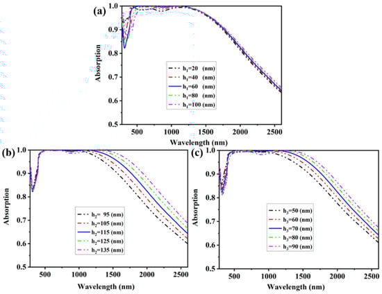 As mentioned above, the proposed solar absorber is composed of four layers (Al2O3-Ti-Al2O3-Ti). In Figure 8 and Figure 9, we investigate different stacking cases of Al2O3 and Ti to figure out that each part is necessary. Here, we further studied the effect of different thicknesses of the Al2O3 and Ti layers on absorption performance while keeping other parameters unchanged. We know that the key role in light absorption is the Al2O3 layer between the metals. The Al2O3 layer covering the top of the structure has little effect on absorptivity. Similarly, we can see in Figure 12a that the thickness of h1 increases from 20 nm to 100 nm, and the emerged absorption bandwidth above 90% becomes narrow from 1485 nm to 1340 nm. Nevertheless, there is still h1 = 60 nm, which has the highest average absorptivity of 99.6% at approximately 400 nm to 1150 nm where solar energy is more concentrated, as in our choice. In Figure 12b, the height of the Ti structure and air hole layer h2 was changed to determine the effect it can have on absorption performance. It is different from Figure 12a: when h2 increases from 95 nm to 135 nm in steps of 10 nm, the total absorption bandwidth becomes wider from 1170 nm to 1555 nm and the short wavelength region remains almost unchanged. However, a wider absorption bandwidth reduces absorptivity from 99.5% to 98.1%. Considering the distribution of solar energy in practical applications, we think it is more important to abandon a certain bandwidth to increase the absorption (almost 100%) in this area. The thickness of h2 = 115 nm became our final choice for the proposed material. For the influence of the changes in h3, it is similar but weaker when compared with the changes in h2 on absorption (Figure 12c). Due to capacitation increases, when h3 increases from 50 nm to 90 nm, the bandwidth of absorptivity above 90% becomes wider from 1245 nm to 1489 nm but absorptivity decreases from 99.5% to 98.2%. That is why we decided to use h3 = 70 nm as the thickness of the Al2O3 layer between metals. The intensity change in the excited SPR is the physical reason for the effect of these parameters’ change on light absorption performance. The increased thickness of these layers reduces the reflection of arrays and thus improves absorptivity, while an excessive thickness is also detrimental to SPR [53,54]. The proper thickness excites the resonance in the most effective way and obtains the best absorption performance.