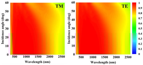 The ideal solar absorber should be insensitive to the polarization angle and oblique incident angle [55,56]. As presented in Figure 13, we calculated the capability at different oblique incident angles from 0° to 60° under the TM mode and TE mode, respectively. In this calculation, we used the Case4 structure, and adopted the geometric parameters of the structure and design section. We found that our proposed absorber keeps an excellent absorptivity in a wide bandwidth. The total absorption bandwidth starts to narrow when the incident angle increases to nearly 60°. It indicates that the oblique incidence angle has little effect on overall absorption. It is obvious that the proposed material under the TE and TM modes performed the same. The high symmetry of the cross elliptical disk arrays contributes to the polarization independence of the absorber. The above analyzed results demonstrate that our proposed absorber still has good absorption ability for complex light in a real application [57,58,59].