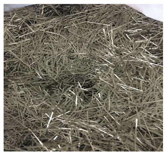 Cement and basalt fibers were added to the soil in the test design. P.O 42.5 ordinary Portland cement was used. The main chemical element, CaO, accounted for 61.56%, SiO2 accounted for 22.03% and SO3 accounted for 2.63% of the overall material. Basalt fiber is a continuous fiber composed of molten basalt stone through high-speed drawing. It has stable chemical properties, a high elastic modulus and tensile strength, a high cost performance and good dispersion and compatibility. This test used chopped fiber, as shown in Figure 2, and its main physical and mechanical indexes are shown in Table 2.
