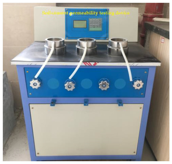 The permeability coefficient of cement-soil is relatively low, generally reaching the order of 10−8~10−9 cm/s. The permeability coefficient cannot be accurately measured using a conventional penetration test device. According to the requirements of “JGJT 233-2011 Design Regulations for Soil-cement Mix Ratio” [42], a TJSS-25 soil-cement permeability testing device was used due to its simple testing principle and operational convenience. In particular, its automatic pressurization can well control the test process and effectively improves the testing accuracy. The permeability test device is shown in Figure 3.