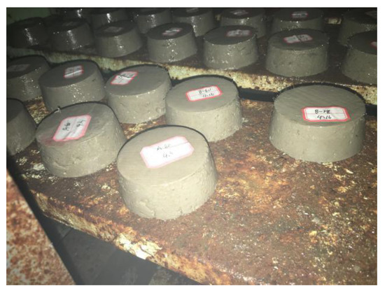 The test model was a round table with an upper inner diameter of 70 mm, a lower inner diameter of 80 mm and a height of 30 mm. The prepared samples were placed in a room for curing to the various corresponding durations. The samples during curing are shown in Figure 4.