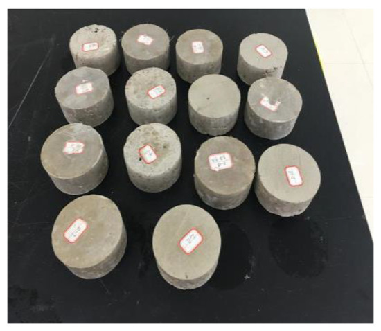 The test molds used in this test were cylinders of 100 mm in diameter and 300 mm in height. After the specimens had been cured for the corresponding period in a standard curing room at a temperature of 20 ± 3 °C and relative humidity of 90%, slices of about 70 mm were cut off from both ends of the samples. Their middle part was then further cut into three cylinders of 100 mm ± 1 mm in diameter and a height of 50 mm ± 2 mm. The samples after cutting are shown in Figure 5.
