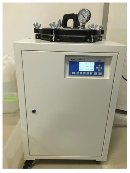 The cut samples were placed in an oven at 80 °C for drying for 4 h before being laid on their side in melted liquid paraffin and rolled over evenly. Once the paraffin on the samples cooled, the rolling was repeated three to four times. Roughly, 0.3 mol/L of NaOH solution and an NaCl solution with a mass concentration of 3.0% were prepared. The wax-sealed samples were then placed vertically in an automatic salt-saturated water machine (BSJ type, Suzhi Yilong Instrument Co., LTD., Beijing, China) and soaked for 18 h, as shown in Figure 6.