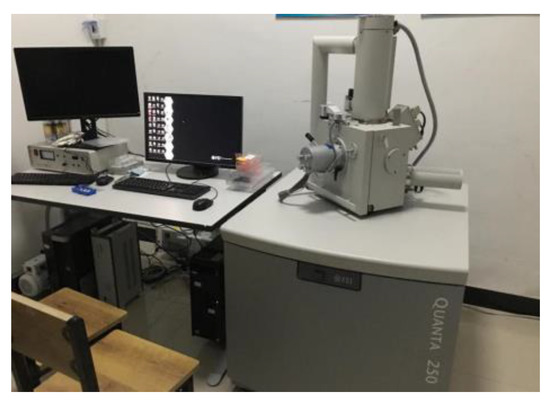 A QUANTA 250 multifunctional scanning electron microscope (FEI Company, Hillsboro, OR, USA), as shown in Figure 8, was selected for the test, which offers a high magnification and stereoscopic image. It can directly observe the fine structure of various uneven surfaces of samples and is very suitable for material science.