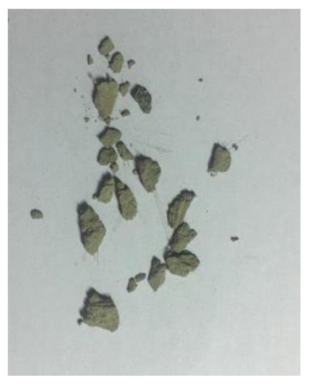 After the chloride ion permeability test, the samples were crushed under pressure and small slices with flat upper and lower surfaces were selected from the crushed samples, as shown in Figure 9. The selected fragments were then immersed in pure ethanol for at least 24 h.