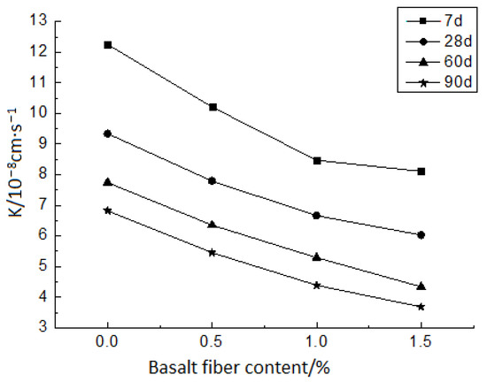 Based on the test results in Table 4, the relationship curve between the soil-cement permeability coefficients and the basalt fiber content was drawn, as shown in Figure 10.