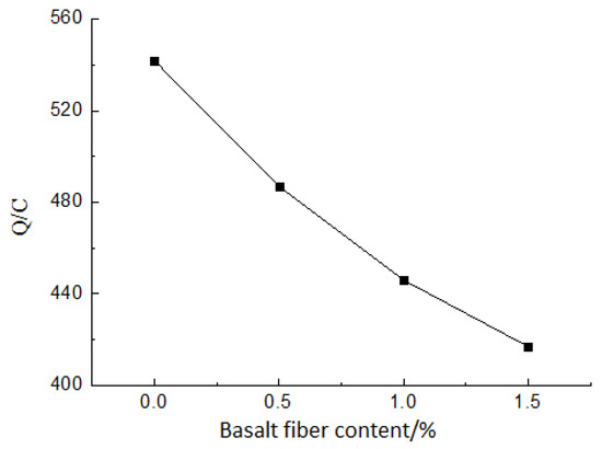 In order to reflect the influence of the basalt fiber content on the chloride ion permeability of soil-cement more intuitively, a broken line diagram of the altered electric flux values according to the basalt fiber content variations was drawn on the basis of the test results of Table 6, as shown in Figure 12.