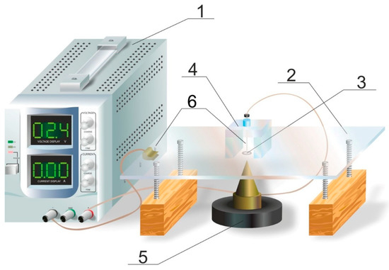 To study the influence of an electric field on the structure of the formed deposits, ITO glass plates (Research and Training Center of Photovoltaics and Nanotechnology, Stavropol, Russia) with a transparent conductive coating were used (Figure 1). The homemade brass needle electrode (6) was lowered into the drop (3) located on the conductive substrate (2), the voltage between which and the conductive substrate was created with a stabilized direct current source MATRIX MPS–3003L-1 type (Martix Technology Inc., Shenzhen, China) (1). The distance between the electrode and the evaporating drop was regulated using a micrometric feed. In the case of studying the formation of a deposit under the simultaneous action of electric and magnetic fields, the installation was supplemented with a magnetizing system (5).