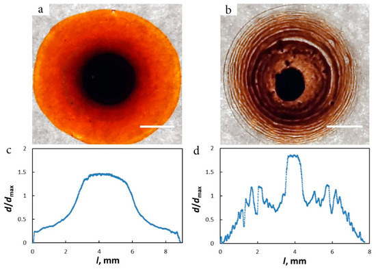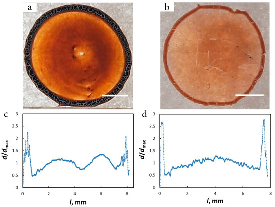 Visual appearance and relative thickness profiles of precipitates formed on a glass substrate under the influence of a non-homogenous magnetic field after evaporation of sample drops No. 1 (a,c) and No. 2 (b,d). Scale bars are 2 mm.