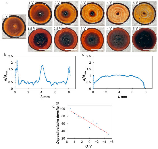 As can be seen, the polarity of the substrate and the needle electrode had a significant influence on the appearance of the dried drop. When a positive potential was applied to the substrate, the thickness of the central part of the deposit decreased compared to the deposit formed without field, while a thin ring remained around the droplet perimeter (Figure 4a upper line). In this case, a dense volumetric deposit was formed directly on the needle electrode. When the polarity of the electrodes was changed the observed effect was contrary and the deposit was evenly distributed over the area of the dried drop. In the latter case, the overall thickness was also much greater (Figure 4a bottom line). This observation was also proved with photometry profiles shown in Figure 4b,c, which were measured for samples at a potential difference between the electrodes U = 5 V. It can be seen that the relative density of the formed deposit was almost linearly dependent on the applied potential of the needle electrode (Figure 4d).