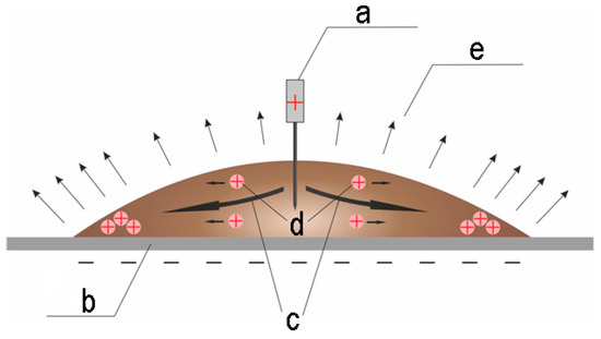 Schematic representation of the processes in a drop when it is dried on a negatively charged surface with a positive needle electrode. Needle electrode (a); ITO glass (b); compensation flow directions (c); nanoparticles (d); the directions of evaporation flux (e).
