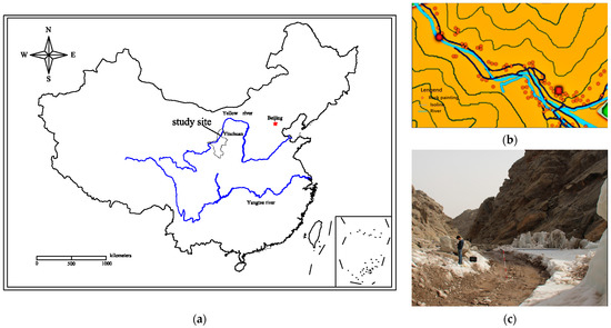Location of the Helan Mountains petroglyphs: (a) the study site; (b) distribution of petroglyphs at study site; and (c) snow at study site.