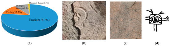 The main weathering types of the Helan Mountains petroglyphs [25]: (a) distribution of petroglyph weathering in Helankou; (b) peeling; (c) erosion; and (d) line drawing of petroglyph corresponding to (c).
