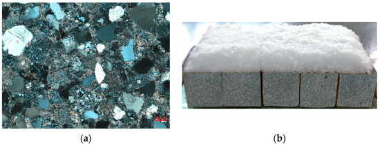 A lot of research has been carried out on the effects on rocks under the action of freeze–thaw cycles, and informative research results have been obtained. It is universally accepted that temperature, moisture content and rock type are the main factors causing rock damage [4,5,6]. The importance of temperature conditions, such as minimum temperature and cooling rate, have been investigated in a number of studies [7], and moisture content has also been reported as a significant factor leading to rock failure following F–T cycles [8]. Rock properties including initial porosity, pore size distribution and mineral content also affect the likelihood of rock failure [9,10,11]. Nicholson [12] conducted a comparative analysis of the mass changes in different sedimentary rocks under different freeze–thaw cycles, and the results showed that the mass loss was greater with increasing numbers of cycles and relatively smaller for sedimentary rocks with high strength. Tan [13] studied the freeze–thaw cycles of sandstone in the temperature range of −40 °C to 40 °C and concluded that the compressive strength of sandstone deteriorates with an increase in the number of cycles. Zhang Jizhou [14] conducted a systematic experimental study on the freeze–thaw damage mechanisms and mechanical characteristics of specimens after freeze–thaw cycling for three types of rocks (mudstone, gabbro and dolomite), and the results showed that rock freeze–thaw damage is influenced by multiple factors, among which environmental factors are significant. Keping Zhou [15] et al. conducted a comparative study on the macroscopic properties and microscopic characteristics of granite after freeze–thaw cycles. They concluded that the physical properties of granite gradually decreased with the increase in cycles. The granite changed from medium to strongly weathered with the increase in freeze–thaw cycles because the internal pores of the rock were continuously damaged and expanded and the porosity increased [16].
