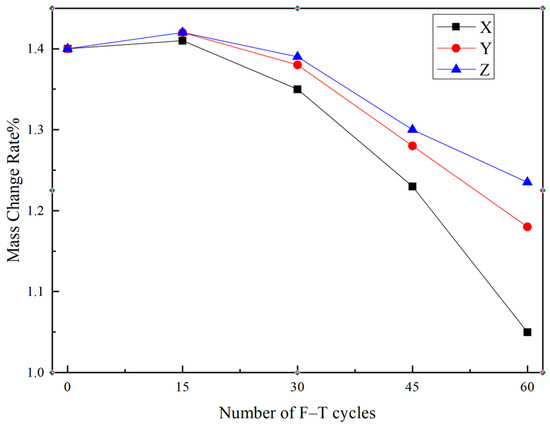 As the weathering cycle progressed, the rate of rock mass loss increased slowly before the 15th cycle, with the treatment groups ordered as follows: Z, Y, X. Then, it decreased significantly after the 15th F–T cycle in the following order: X, Y, Z.