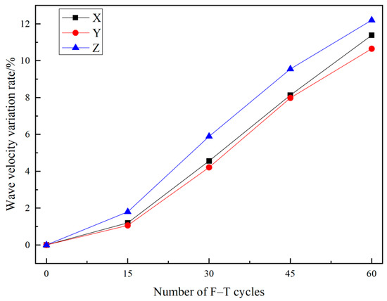 An RSM-SY5 intelligent acoustic detector was used to test the wave velocity of each group of samples. The results showed that wave velocity decreased in all experimental treatments (Figure 5). The wave velocity of the samples in Group X decreased by 21.44%, the samples in Group Y decreased by 19.89%, and the samples in Group Z decreased by 17.53%.
