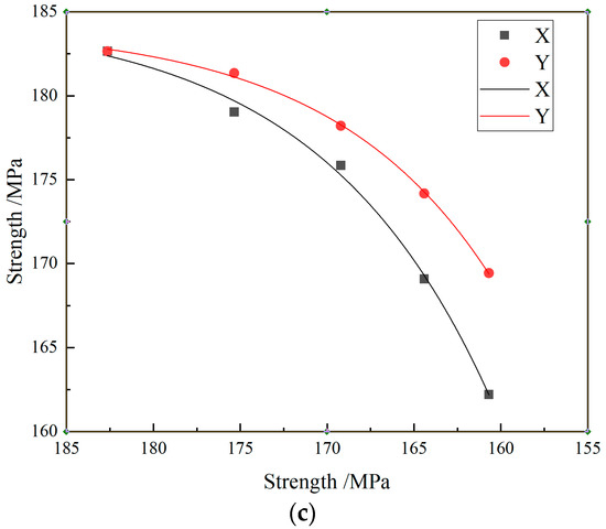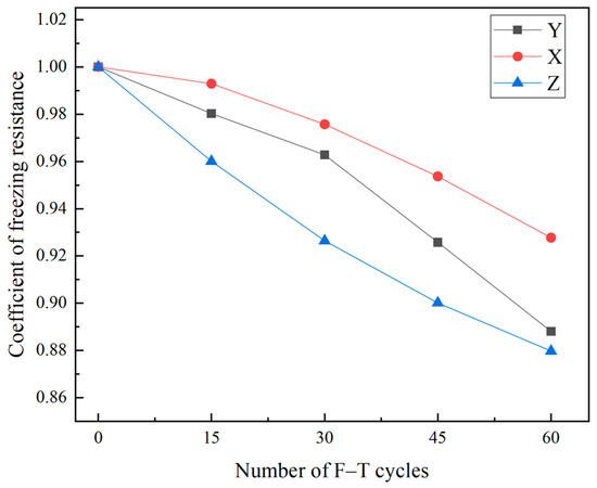 For Group X, the coefficient of freezing resistance decreased slowly in the freeze–thaw series, from 1.0 to 0.996 before the 15th cycle. After that, it changed faster, almost linearly, i.e., it decreased from 0.982 to 0.961 and, finally, to 0.931 by the 30th, 45th, and 60th cycles, respectively. Overall, the Group X sample strength decreased by 6.9%. For Group Y, the coefficient of freezing resistance decreased slowly before 30th cycle and quickly after that; overall, the Group Y sample strength decreased by 10.7%. However, unlike the X and Y groups, the change law of the frost resistance coefficient of Group Z almost conformed to the linear law, and decreased by 12.1% (Figure 6).