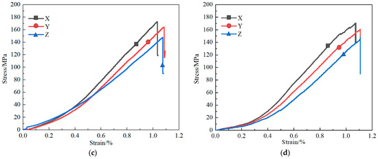 Stress–strain curve of three freeze–thaw cycle treatments at (a) 15 cycles; (b) 30 cycles; (c) 45 cycles; and (d) 60 cycles.