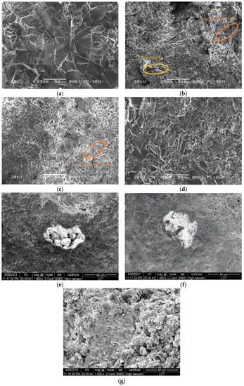 SEM photographs of rock after 60 F–T cycles for three treatments: (a) untreated samples (500×); (b) snowmelt (500×); (c) rain infiltration (500×); (d) normal F–T (500×); (e) corrosion of feldspar (1000×); (f) corrosion of calcite (1000×); and (g) increase in clay (1000×).