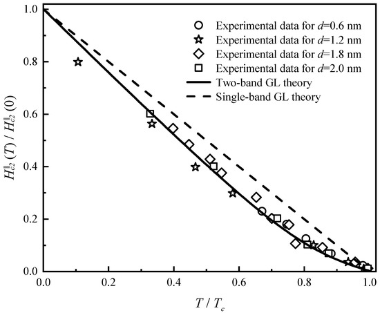 We can easily see from Equations (16) and (17) that the normalized upper critical fields are independent of the film thickness d, and these values can be explicitly computed with two scale-invariant parameters and . We choose and to match the experimental measurements of the NbSe films and plot the theoretical results in Figure 1 and Figure 2. From Figure 1 and Figure 2, it is shown that our calculations can fit the experimental data well in the whole temperature range. Meanwhile, according to Ref. [27], the exact expressions of parallel and perpendicular to the c-axis based on the single-band GL theory can also be written as and , respectively. Here, m denotes the single-band effective mass, and the coefficient can be approximately written as with the proportionality constant. We also show the single-band computations in Figure 1 and Figure 2 as comparative studies. From Figure 1 and Figure 2, we can see that the two-band model can fit the experimental measurements with the various film thicknesses better than the single-band theory.