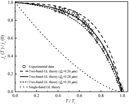 Then the maximum , i.e., , can be found according to the condition with Equation (23). We can observe that the normalized critical supercurrent density is independent of . With the GL parameter μm, we plot our numerical calculations in Figure 4. For comparison, we also plot the single-band result [28] in Figure 4. Furthermore, we can see that our theoretical analysis based on the two-band model is consistent with the experimental measurements for the 2.0 nm thick NbSe film in temperature down to 0.4 , which further confirms the multi-band character of the corresponding systems.