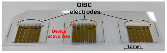 The second electrode was fabricated on the substrates through a sequential deposition of an Al2O3 insulating layer (100 nm), a chromium layer (10 nm), and a gold layer (70 nm) using an electron beam evaporator (Nexdep PVD, Angstrom Engineering Inc., Kitchener, Canada). The thickness of the layers was controlled using a crystal quartz monitor during the deposition process, and was confirmed using a profilometer (Dektak XT Stylus Profiler, Bruker, Billerica, MA, USA). The gold layer of the second electrode serves as the metallic contact of the anode layer. After, the remainder of photoresist was removed from the substrates by rinsing them with acetone (the lift-off process), resulting in QIBC electrodes ready to use for the fabrication of PFQIBC PSCs. It should be noted that the QIBC electrode system for PFQIBC PSCs does not have the HTL, i.e., hole extraction in devices relies on a Schottky junction between the perovskite layer and the gold layer of the QIBC electrode system. The detailed process of electrode fabrication is depicted in Figure S1 in the Supplementary Materials. A photo-image of the prefabricated QIBC electrodes on the PET/ITO substrate is shown in Figure 1.