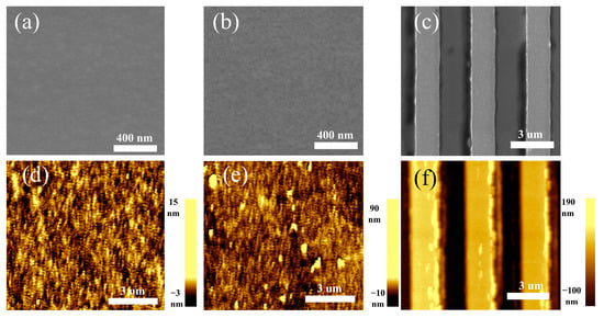 The SnO2 and Au layers have root mean square (RMS) values of 12.9 and 23.4 nm, respectively, and were estimated using an atomic force microscope (AFM). This indicates that the anode and cathode layers are smooth without any significant defects (Figure 4d,e). The SEM images also confirm the good quality of the anode and cathode layer, which are free of pinholes and defects (Figure 4a,b). The fabricated QIBC electrodes were also of good quality as there were almost no defects after the lift-off process and the top electrode features were not broken (Figure 4c,f).