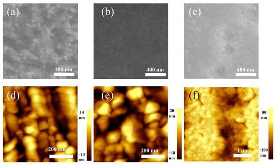 SEM top view and AFM images of a perovskite film on the ETL layer (a,d), HTL layer (b,e), and the QIBC electrodes (c,f), respectively.