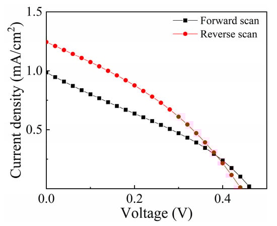 Figure 6 depicts the measured current density-voltage (J-V) characteristic curves of an experimentally obtained PFQIBC PSC. The J-V curves indicate that the tested device has a low hysteresis index value of 0.22. (See Figure 6). The open-circuit voltage (Voc), short-circuit current (Jsc), fill factor (FF) and PCE of the device extracted from the J-V curves are shown in Table 1. The prepared devices did not show a visible sign of degradation after storing them in a dry nitrogen atmosphere for the duration of 1 month. However, a comprehensive study to assess the stability of the prepared devices [32,33] was not conducted within the scope of this work.